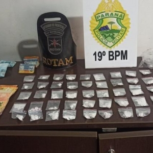 Durante um patrulhamento de rotina no bairro Boa Esperança, em Toledo, uma equipe da ROTAM abordou um motociclista suspeito que transitava com a placa do veículo ilegível. A ocorrência resultou na apreensão de 93 gramas de cocaína já fracionadas e prontas para comercialização.