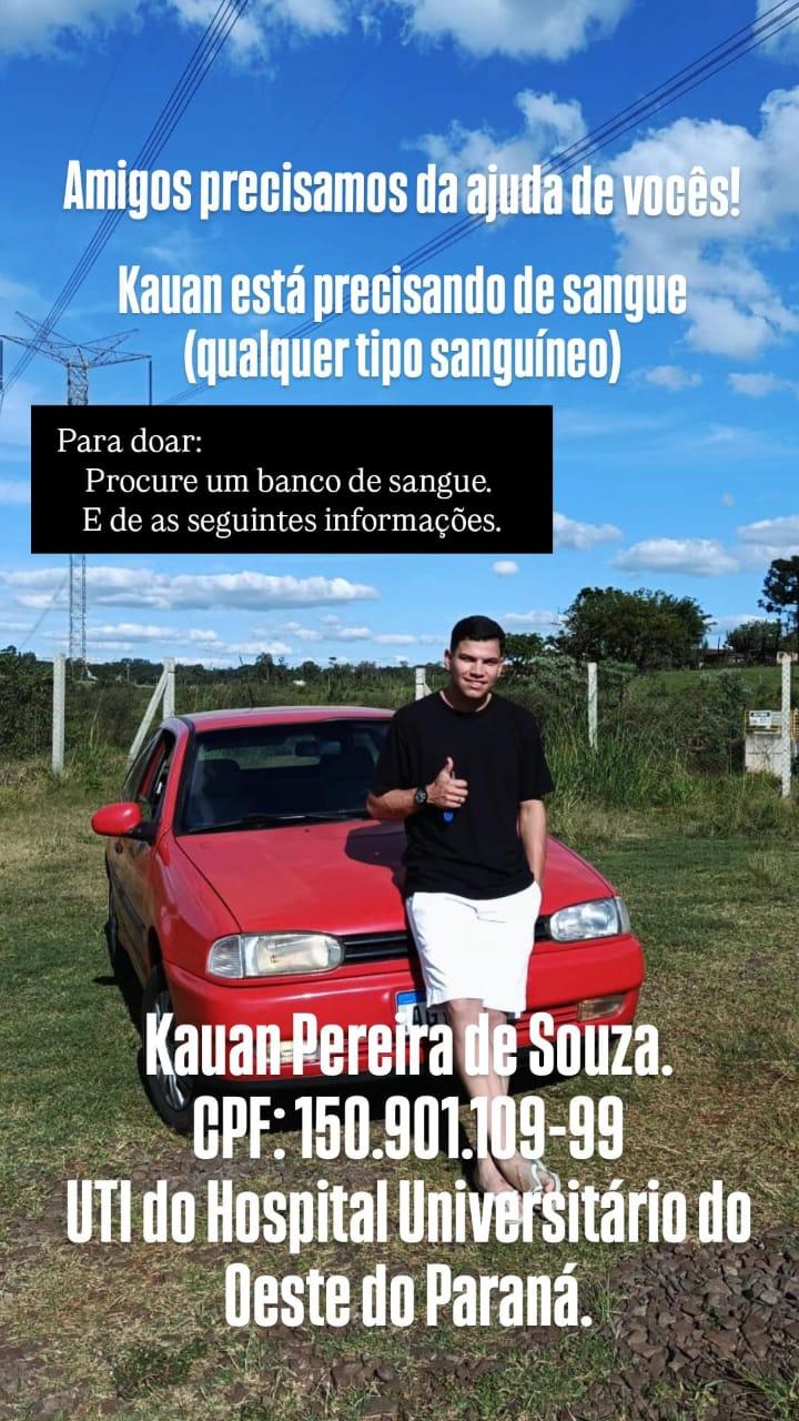 Familiares e amigos de Kauan Pereira de Souza estão mobilizando uma campanha de doação de sangue para ajudar no tratamento. Segundo o pedido divulgado pela família, doações de qualquer tipo sanguíneo podem ser feitas em bancos de sangue, informando o nome do paciente, que está internado na UTI do Hospital Universitário do Oeste do Paraná.