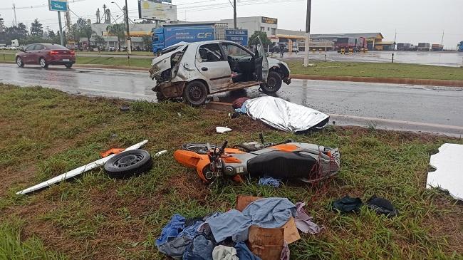 Na sequência, uma motocicleta colidiu na lateral do Celta, e a motociclista entrou em óbito na hora. Infelizmente, a motociclista perdeu a vida na hora e seus pertences ficaram espalhados na rodovia. Devido a força do impacto, o carro e a moto ficaram extremamente danificados. Além da morte de Andressa, uma mulher que estava no Celta ficou ferida e foi avaliada pelos socorristas do Samu e do Siate.
