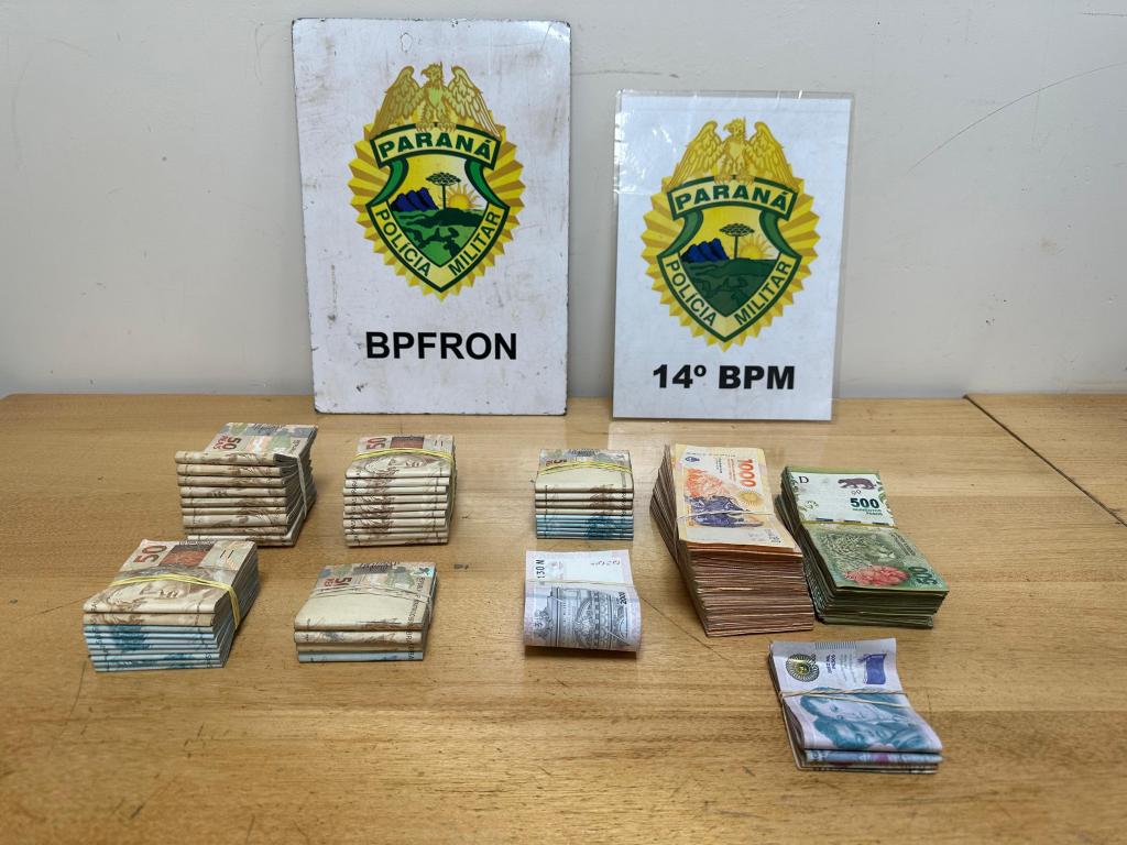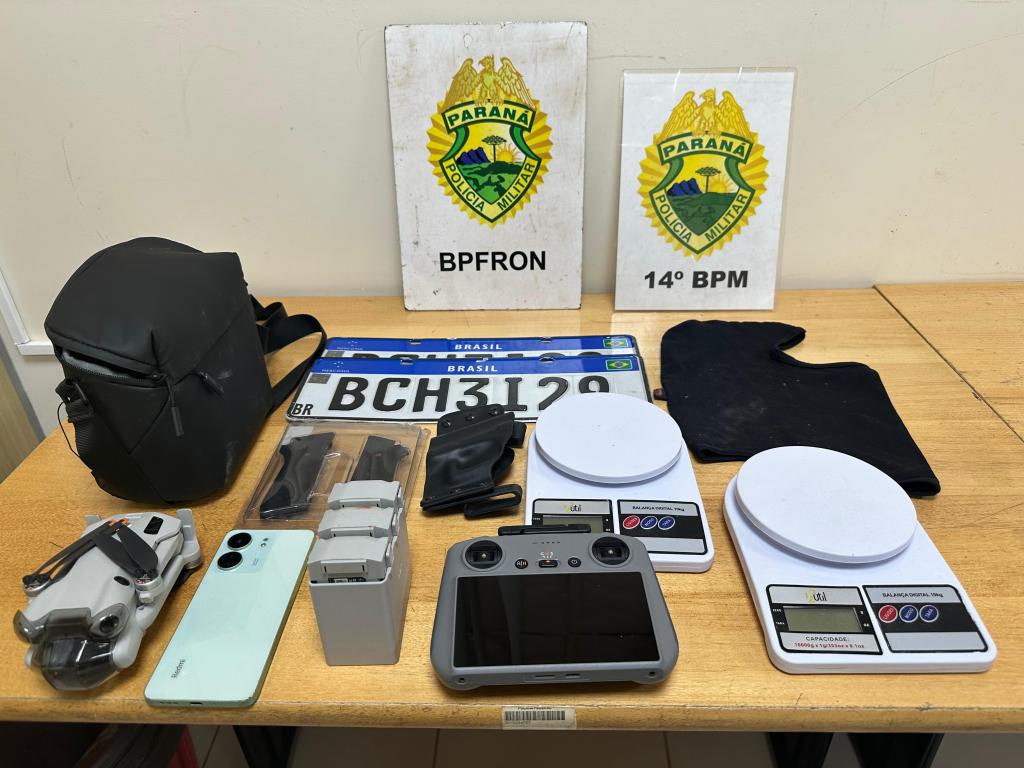 As equipes policiais conseguiram detê-lo e apreenderam uma pistola Glock G34 9mm, além de localizar na residência: 121 kg de substância análoga à cocaína, 0,541g de substância análoga à maconha, 01 carabina Colt cal. 5.56, 01 simulacro de arma de fogo tipo pistola (airsoft), 02 carregadores de pistola 9mm, 01 carregador de pistola .40mm, 15 munições cal. 357, 24 munições cal. 9mm, 02 munições cal. 22, 01 drone, 03 baterias de drone, 02 balanças de precisão, 02 placas de veículo, 984 baterias de celular, 43.870,00 reais, 675.700 pesos argentinos (R$ 4.003,79) e 100 dólares falsos.