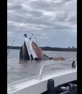 O vídeo mostra a lancha só com ponta para fora da água, uma outra embarcação se aproxima para ajudar, de onde é realizada a filmagem.