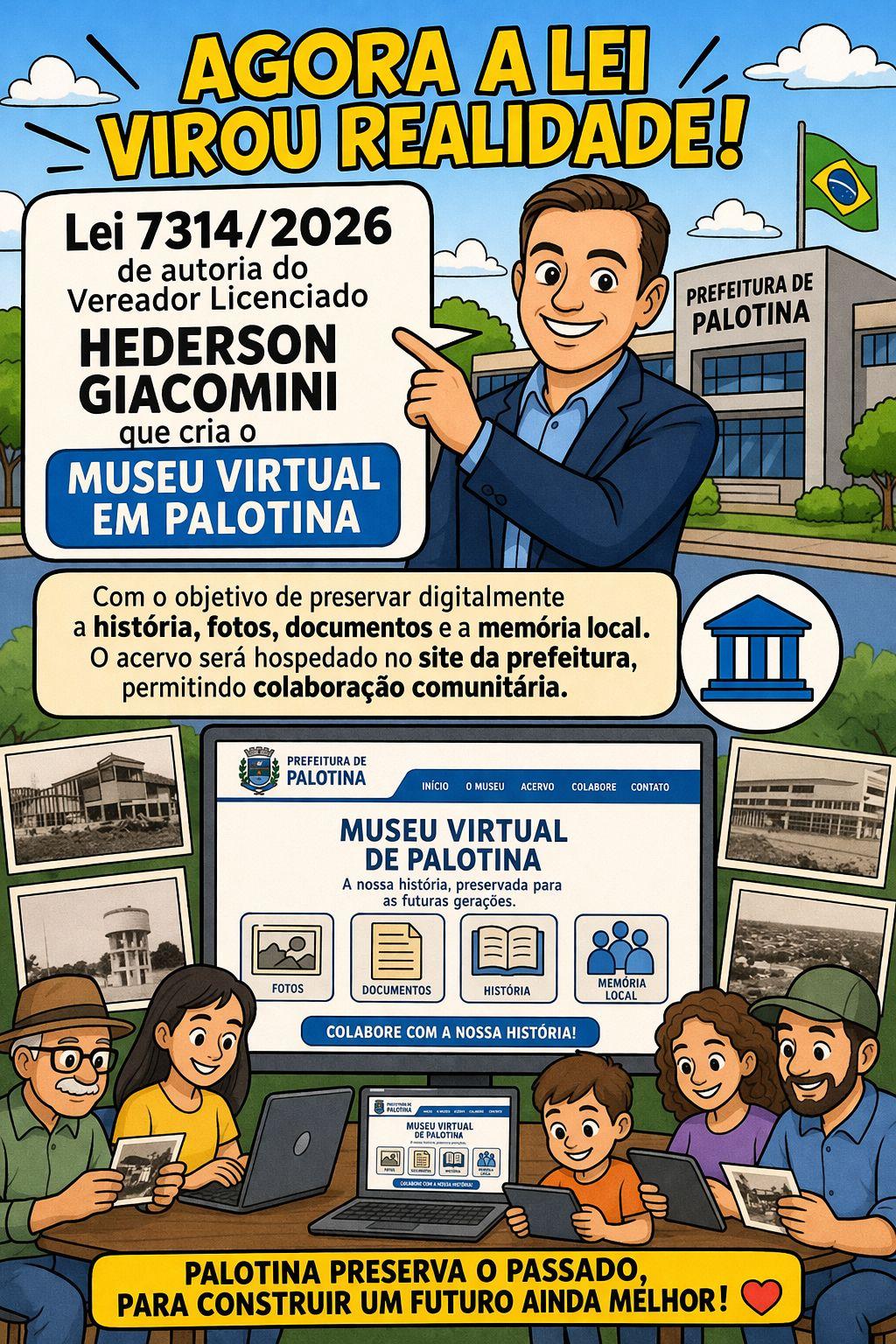 A Lei nº 7.314/2026, de autoria do vereador licenciado Hederson Giacomini, institui oficialmente o Museu Virtual de Palotina.