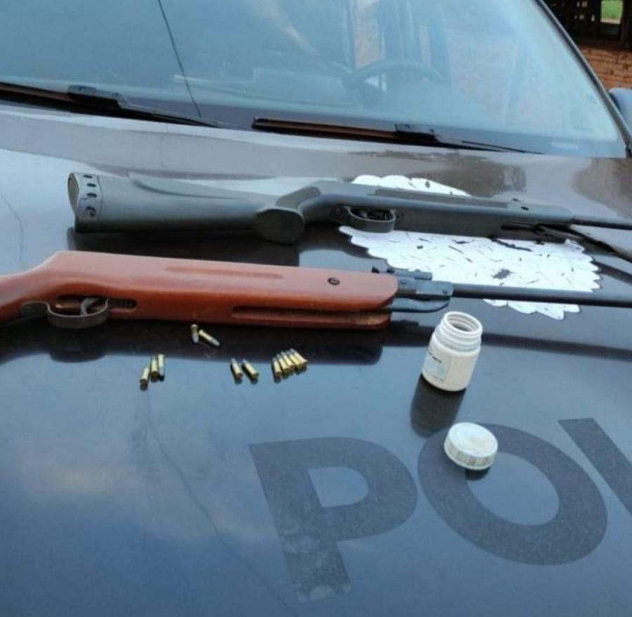 Na continuidade das diligências na propriedade do indivíduo que estava comprando a droga do ex-vereador, foram localizadas duas armas de fogo carabina cal .22 e 12 munições.