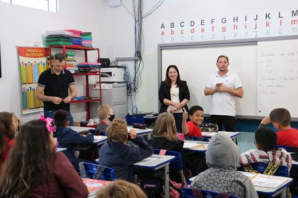 O prefeito Rodrigo Schanoski e a vice-prefeita Janaína Müller Geraldi juntamente com o secretário de Educação, Jony Zils fizeram a entrega em algumas salas de aula da Escola Kuroli na manhã desta terça-feira (23). Durante o dia, os ingressos serão entregues aos demais estudantes.