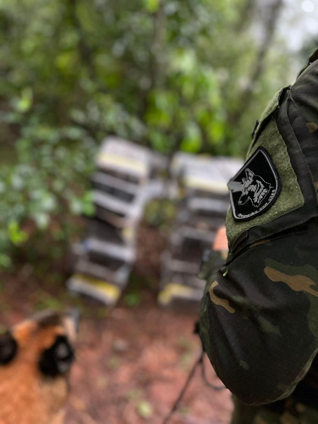 Policiais do Batalhão de Polícia de Fronteira realizavam patrulhamento em portos clandestinos em Santa Helena nesta quinta-feira quando o cão farejador do Pelotão de Operações com Cães do BPFRON indicou a presença de ilícitos em uma determinada região de mata.