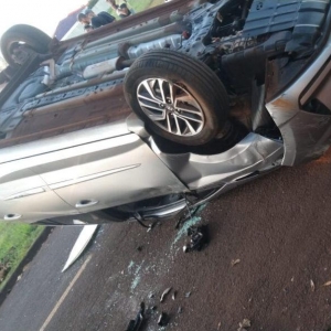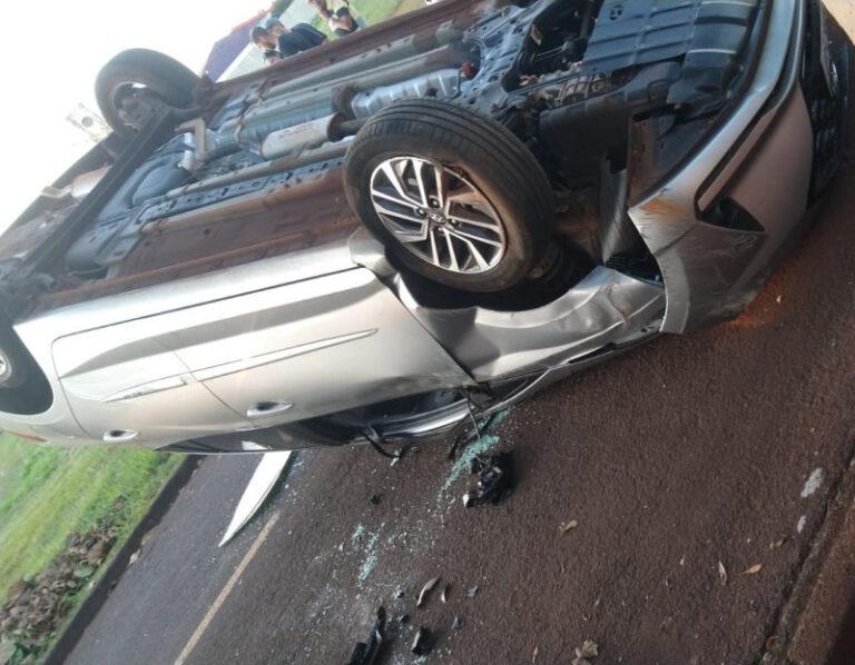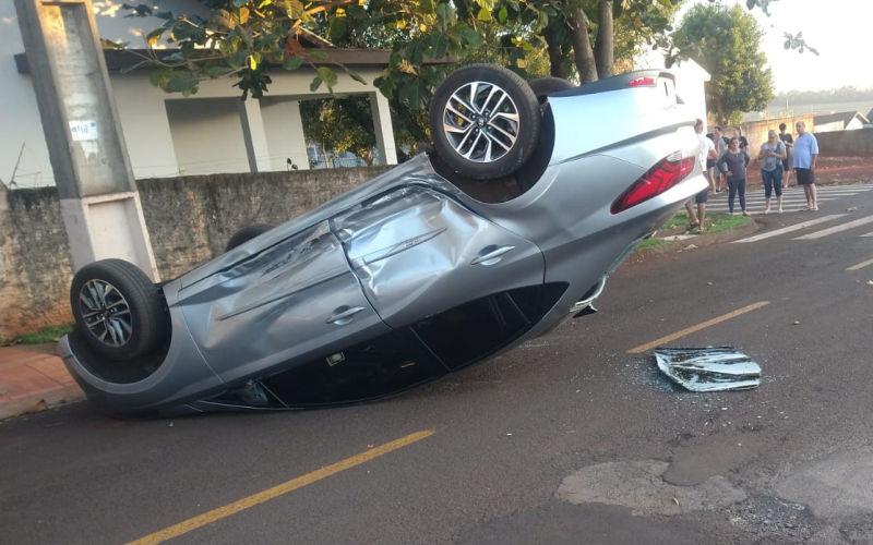 Conforme informações um veículo Celta invadiu a preferencial e um HB20 acabou colidindo, após o impacto o HB20 capotou e parou com as rodas para cima.