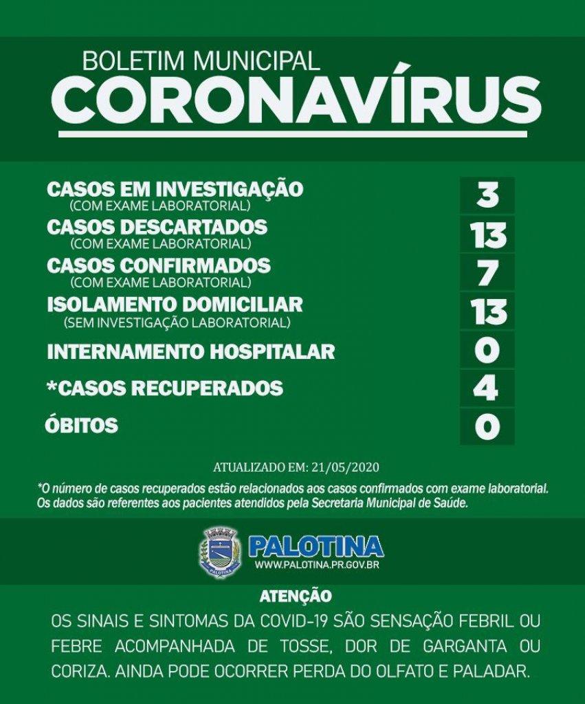 A secretaria municipal de Saúde de Palotina informou na tarde desta quinta-feira (21), que mais um palotinense que havia atestado positivo para o coronavírus saiu do isolamento e está curado.