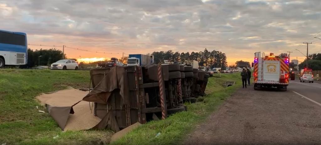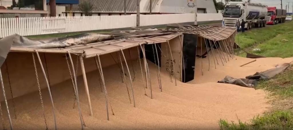 O semirreboque acoplado ao caminhão também tombou, provocando o derramamento da carga sobre a pista. Apesar do impacto, o motorista não se feriu.
