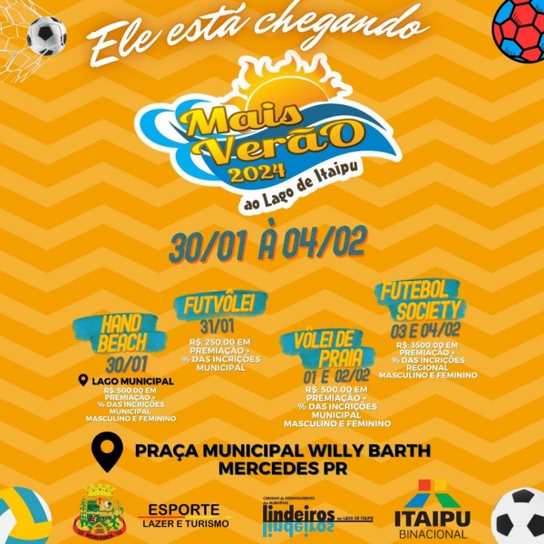 O Município de Mercedes, em parceria com o Conselho dos Municípios Lindeiros e Itaipu Binacional, promove a partir desta terça-feira (30) o Projeto Mais Verão ao Lago de Itaipu 2024, que oferece diversas atividades esportivas e culturais para a população.