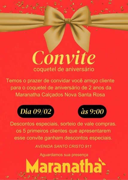 A Maranatha Calçados de Nova Santa Rosa está em festa completando seus 2 anos na cidade. E, para comemorar, com muito prazer e alegria convida toda a comunidade para participar do Coquetel de Aniversário.