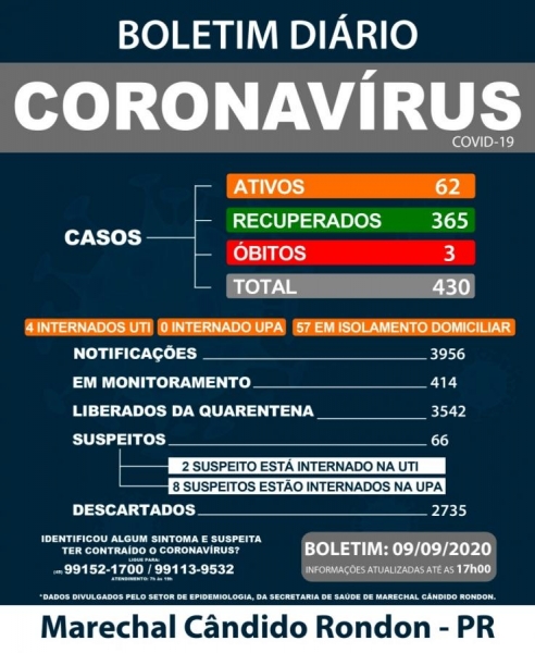 Marechal Cândido Rondon segue com quatro pessoas internadas na UTI e 57 em isolamento domiciliar por Covid-19 nesta quarta-feira (09), segundo boletim, totalizando 62 casos ativos.