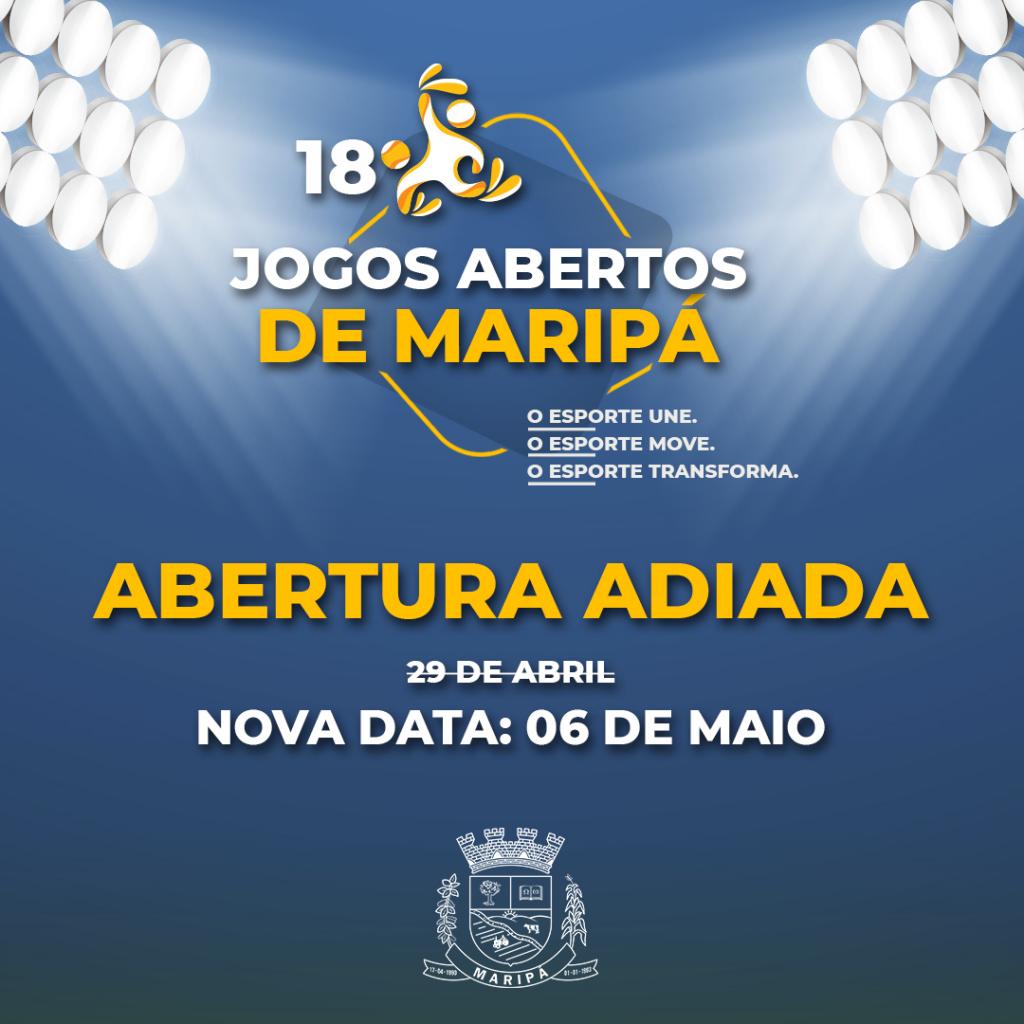 A Secretaria de Educação, Cultura e Desporto de Maripá por meio do Departamento de Esportes informa que a abertura dos Jogos Abertos, marcada para esta sexta-feira (29), foi adiada para o dia 6 de maio. A transferência da data se deve ao recente temporal que atingiu a cidade no último dia 22.