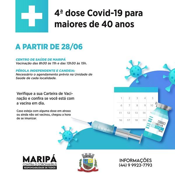 A Secretaria Municipal de Saúde de Maripá informa que está liberada a 4ª dose da vacina contra a covid-19 para a população acima de 40 anos. A aplicação ocorrerá a partir desta terça-feira (28), no Centro de Saúde de Maripá. O horário de atendimento na Sala de Vacina é das 8h30 às 11h e das 13h30 às 15h.