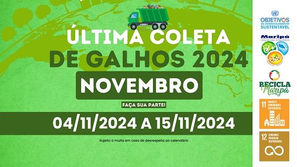 A última coleta de galhos de 2024, estabelecida pelo cronograma anual, começou hoje (04) e vai até sexta-feira (15) de novembro. Durante este período, os moradores devem colocar os galhos em frente à sua residência para que sejam recolhidos pelas equipes da Secretaria Municipal de Viação, Obras e Serviços Públicos.
