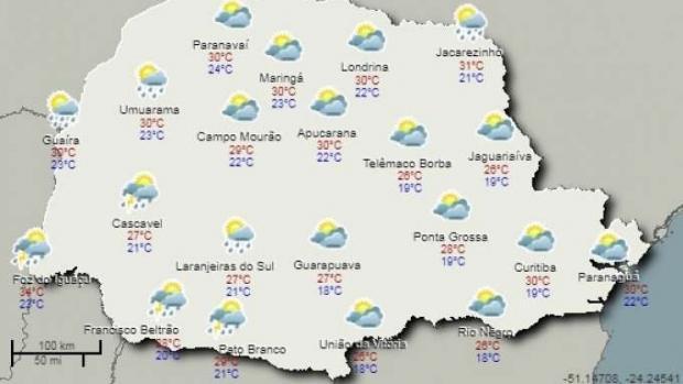 Nas regiões Oeste e Sudoeste do Paraná, as chuvas estão previstas acompanhadas com trovoadas. Já para a região Noroeste, não há presença de descargas elétricas.