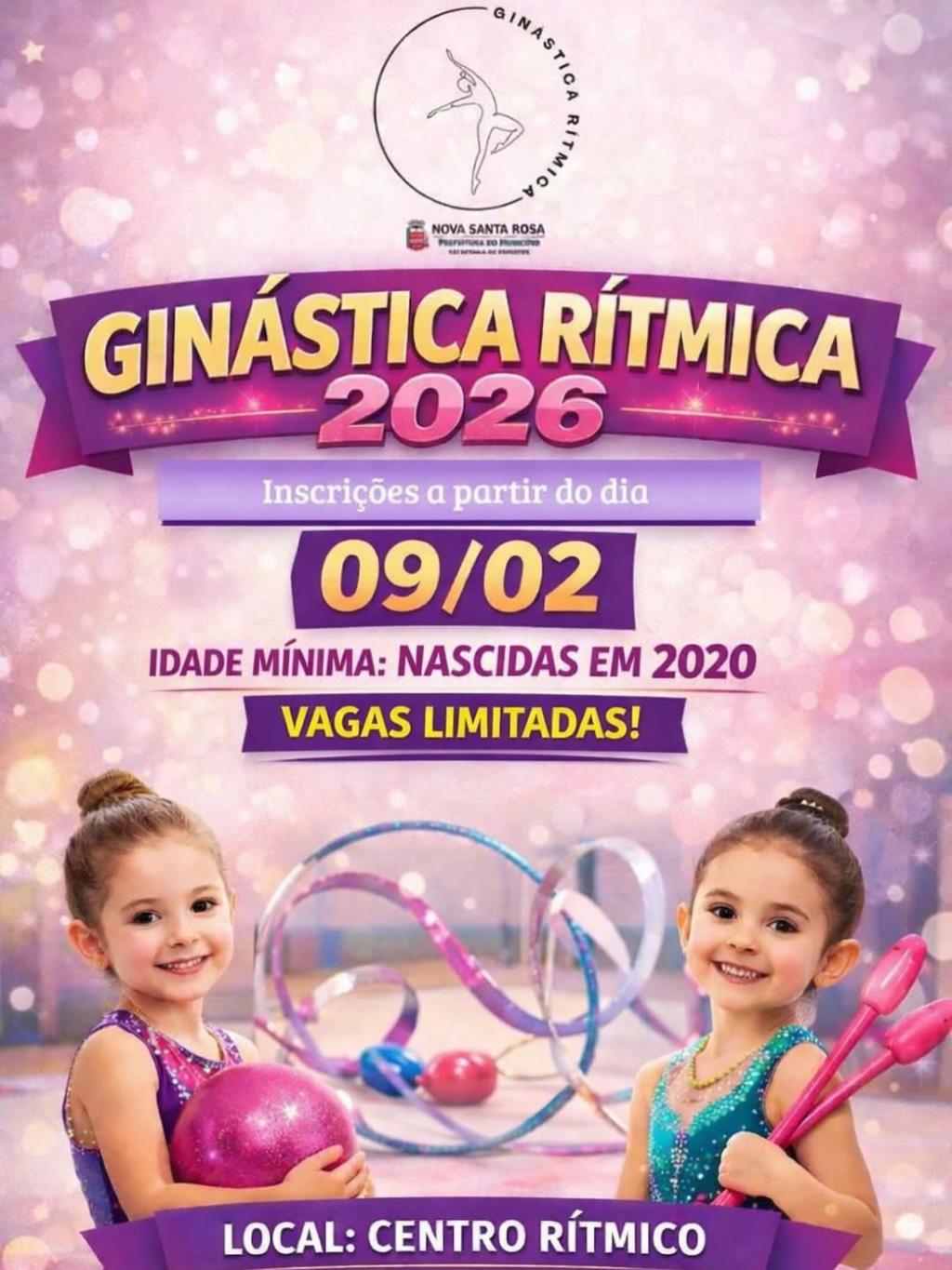 As matrículas para as aulas de Ginástica Rítmica iniciam no dia 09 de fevereiro de 2026. Podem se inscrever meninas com idade mínima nascidas em 2020 e idade limite de 15 anos.