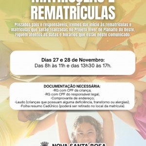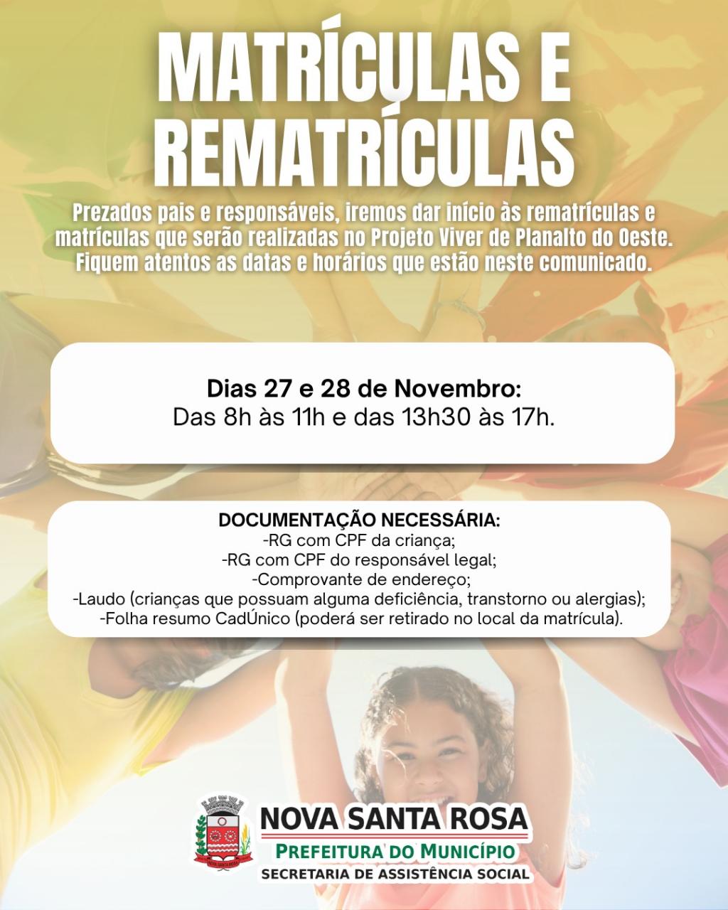 A Secretaria de Assistência Social de Nova Santa Rosa informa que serão realizadas, nos dias 27 e 28 de novembro, as matrículas e rematrículas do Projeto Viver de Planalto do Oeste. Pais e responsáveis devem ficar atentos às datas, horários e à documentação necessária para efetivar o processo.