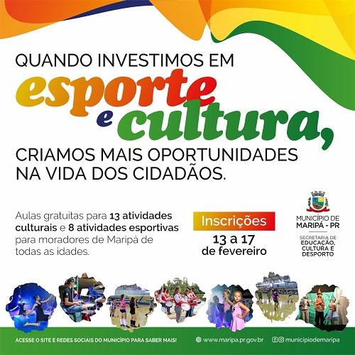 ATIVIDADES - Na área cultural, os maripaenses tem a disposição aulas de Língua Alemã, Viola Caipira, Acordeon, Bateria e Percussão, Banda Sinfônica Municipal, Ballet/Jazz, Violino, Musicalização/Violão, Canto e Coral, Teatro, Arte Circense, Fanfarra Municipal e Dança Alemã. As matrículas para aulas de Ginásticas Rítmica e Zumba serão realizadas junto com as matrículas da cultura.
