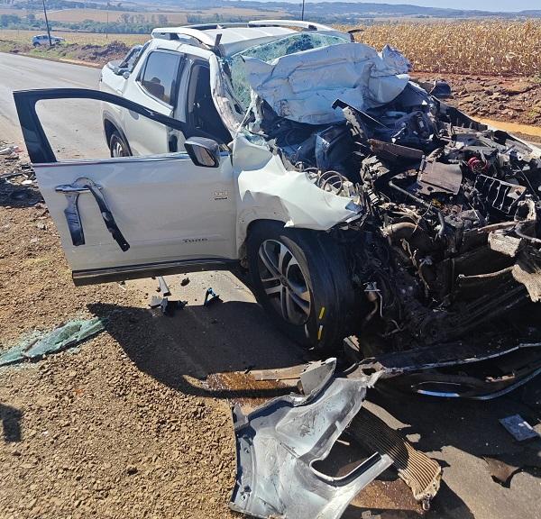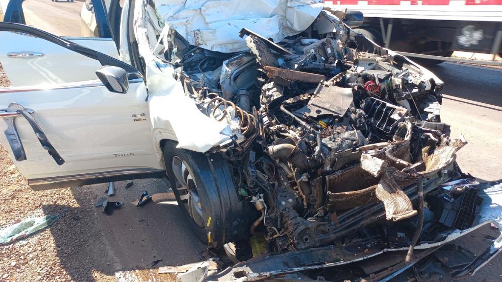 O veículo Fiat Toro teve a parte frontal completamente destruída na colisão.