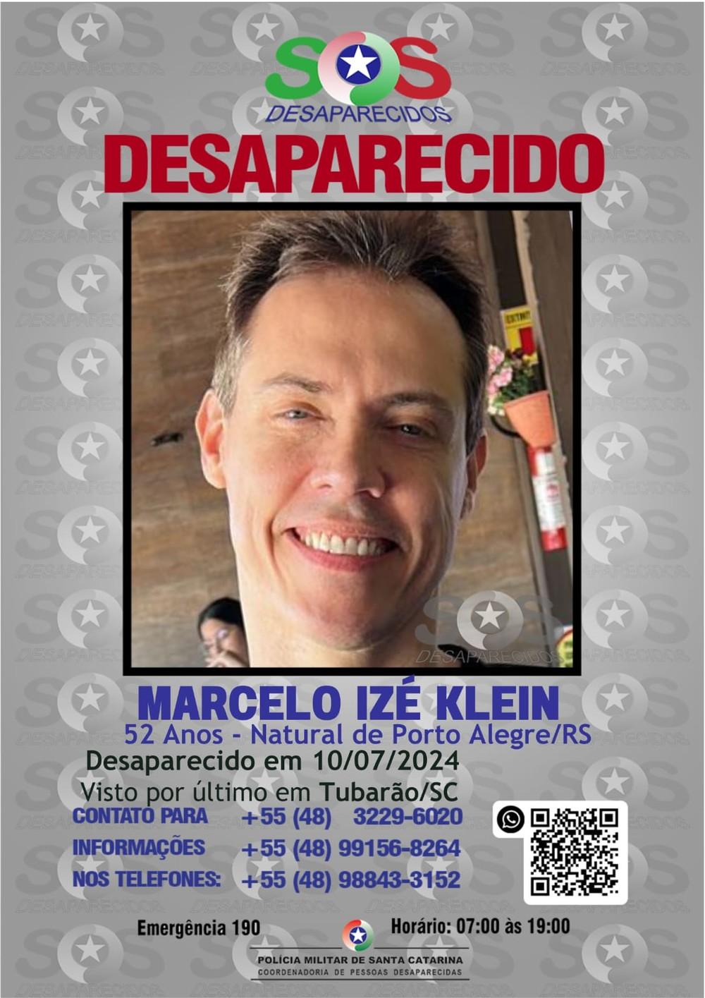 O médico Marcelo Izé Klein está desaparecido há 3 semanas. Visto pela última vez em 10 de julho, ao sair de casa em Tubarão, no Sul de Santa Catarina, o profissional tem 52 anos e trabalha há cerca de 15 anos no Instituto Nacional do Seguro Social (INSS).