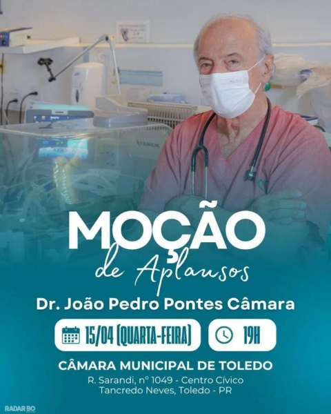 O trabalho silencioso e essencial de quem atua na linha de frente pela vida dos recém-nascidos será reconhecido em Toledo. O médico pediatra intensivista neonatal Dr. João Pedro Pontes Câmara será homenageado com uma Moção de Aplausos em sessão marcada para quarta-feira (15), à noite, na Câmara Municipal.