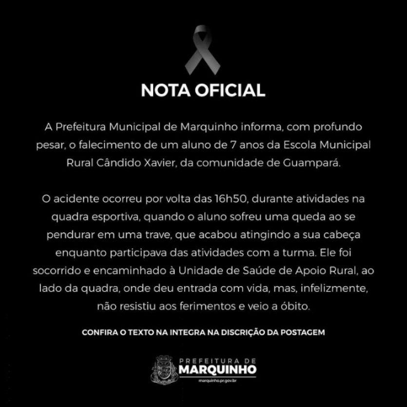 Em nota oficial, a administração municipal lamentou a tragédia e informou que as secretarias de Educação e Saúde, junto à equipe pedagógica, estão prestando apoio e acolhimento aos familiares da vítima.