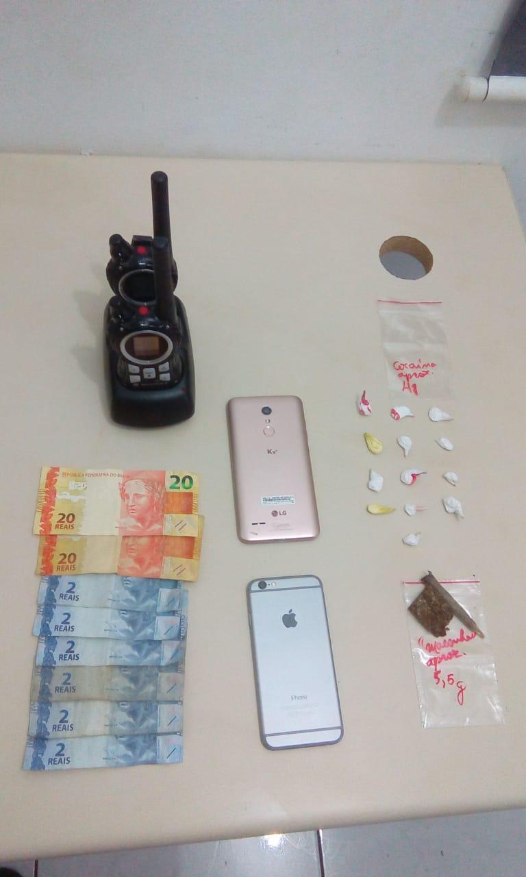 Diante disso, foi realizada a abordagem pela equipe e constatada com a menor de idade um cigarro com substância análoga à maconha. Já na residência do menor de idade, na mesma localidade, após averiguações pelos policiais foi encontrado uma quantidade de maconha, 13 buchas de substância análoga à cocaína, 2 rádios comunicadores, um aparelho celular, Iphone 6, do qual o indivíduo não soube informar a procedência, além de 50 reais em notas variadas.