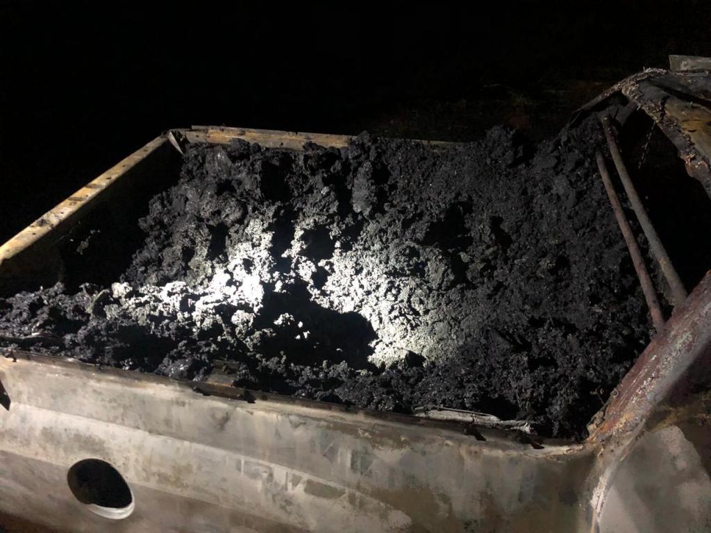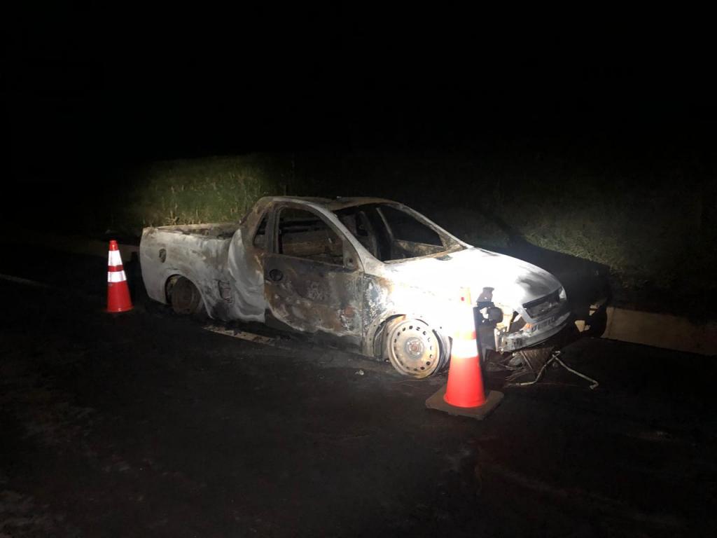 Ao retornar ao veículo, a parte dianteira já estava em chamas. Foi possível retirar de dentro um rádio HT GP-78, que estava ligado, e visualizar pacotes de agrotóxicos na cabine e carroceria.