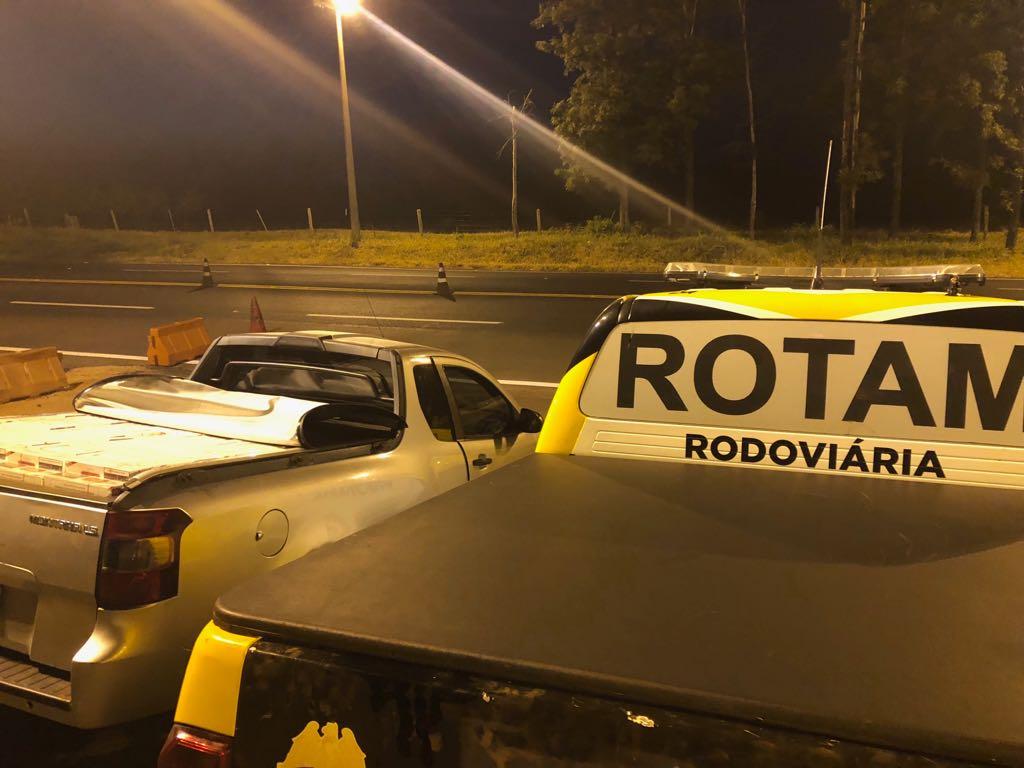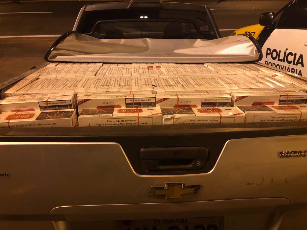Em operação na PRC-272, por volta das 04h45 desta quarta-feira (02), foi dado ordem de parada a um comboio de veículos que trafegavam em alta velocidade, porém a ordem não foi acatada, iniciando assim um acompanhamento tático, com sinais luminosos e sonoros, sendo que em determinado momento os veículos entraram em uma estrada de chão, onde foi localizado em meio a plantação de milho o veículo, GM/Montana, licenciado no município de Curitiba, o qual estava transportando aproximadamente 20 (vinte) caixas de cigarros de origem estrangeira, sem a devida documentação fiscal.