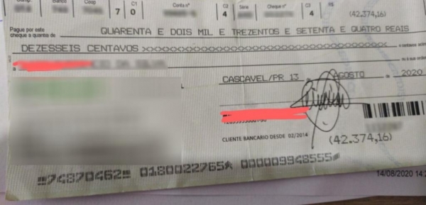 Um morador de Cascavel de 34 anos foi preso na tarde desta sexta-feira em uma cooperativa de crédito, no momento que tentava depositar um cheque clonado com valor de R$ 42.374,16.