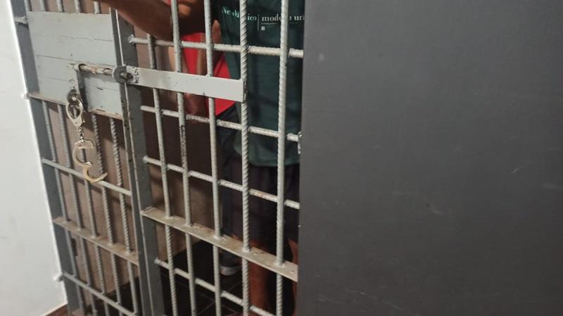 Após algemado foi colocado dentro do camburão da viatura e o elemento começou a chutar e danificou a parte interna do camburão, quando chegou na delegacia o preso foi colocado no coró e continuou gritando e ofendendo os guardas batendo contra a grade.