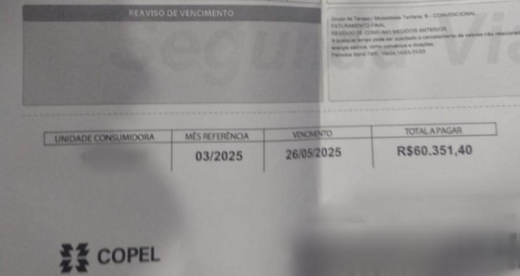 Segundo a moradora, a Copel informou que fará uma análise do histórico de consumo recente e poderá gerar um novo boleto com valor médio aproximado.