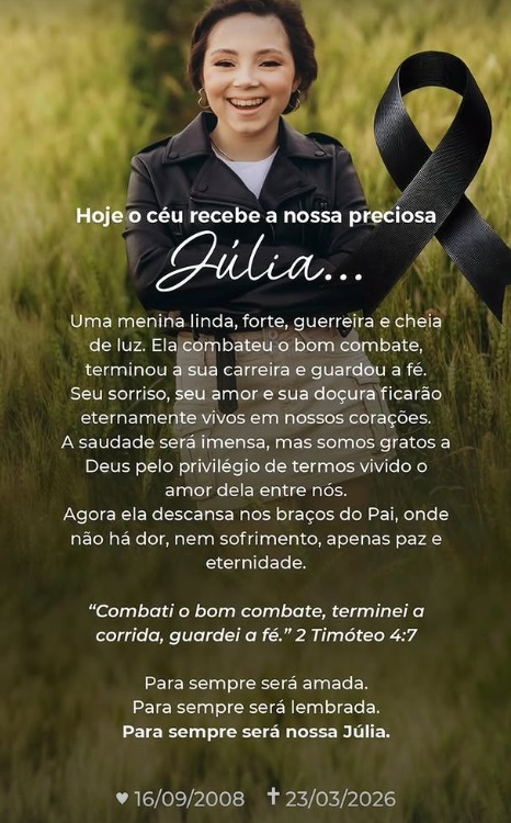 Morreu nesta segunda-feira (23) a adolescente Júlia Motta, de 17 anos, que enfrentava um câncer raro em Cascavel. A jovem ficou conhecida por mobilizar a comunidade e pessoas de diversas regiões do país em uma grande campanha solidária em busca de um tratamento que pudesse salvar sua vida.