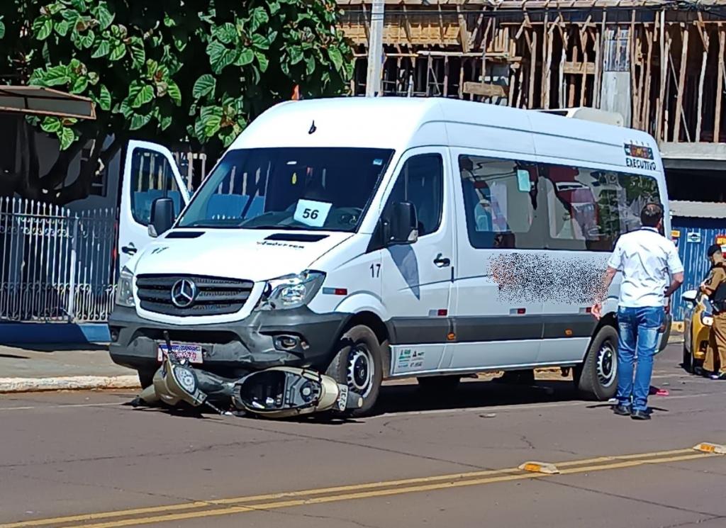 A colisão envolvendo uma Van Mercedes Benz e uma motocicleta Honda Biz 125, aconteceu na rotatória da Rua Independência esquina com Rua Pernambuco, por volta das 12h50.