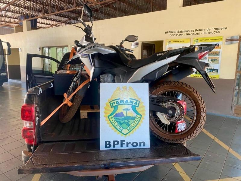 Durante patrulhamento na área rural de Guaíra, policiais do Batalhão de Polícia de Fronteira (BPFron) localizaram uma motocicleta Honda/XRE 190 escondida em meio à mata.