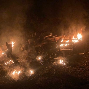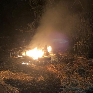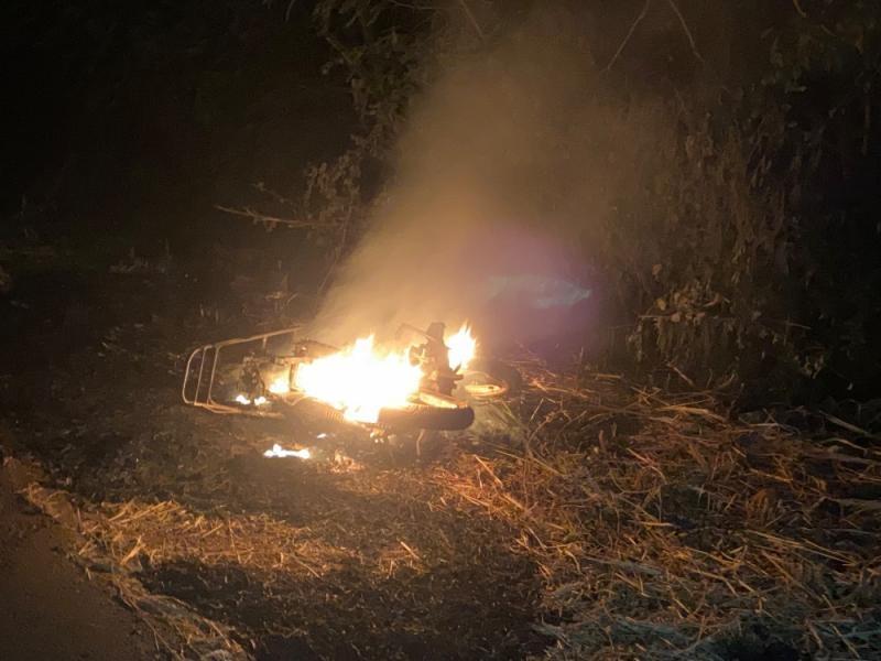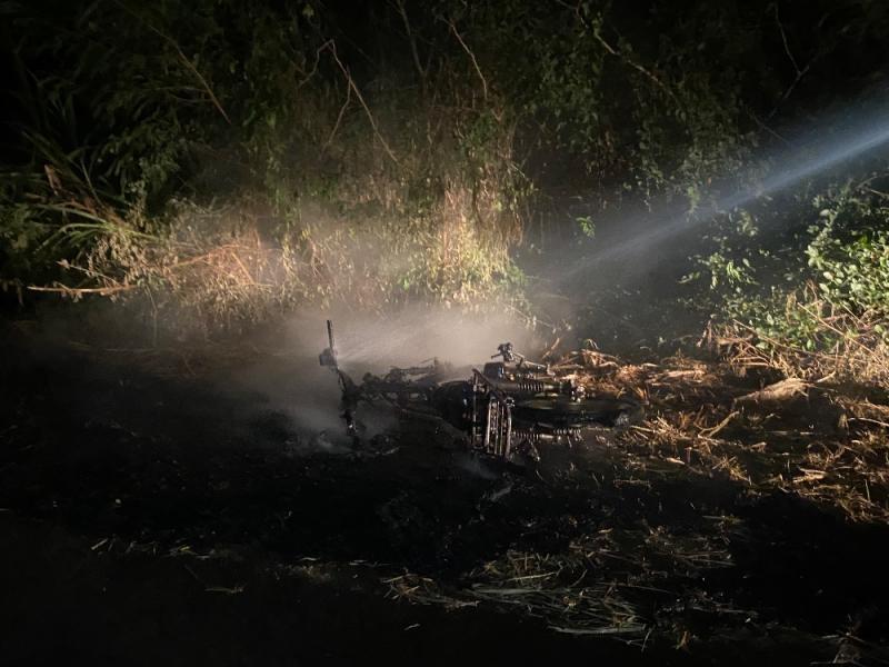 Uma moto ficou destruída após pegar fogo, na noite da segunda-feira (17), na saída de Mercedes para Três Irmãs.