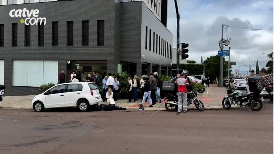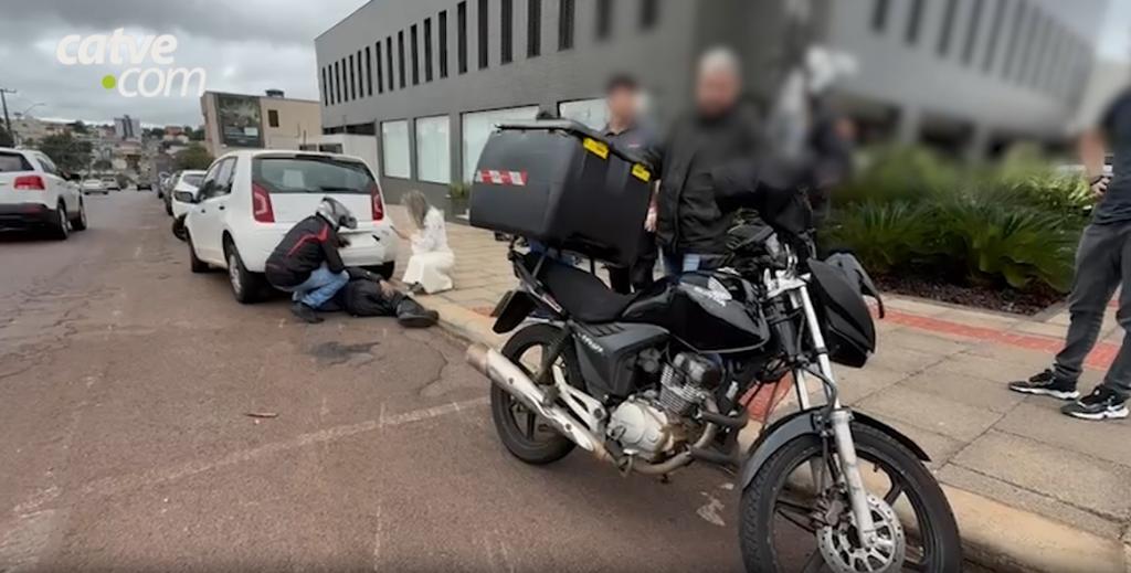 Com o impacto, o motociclista foi projetado para de baixo de um carro estacionado. Populares que estavam no local, se reuniram para levantar o Volkswagen Up.