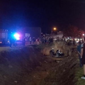 Com a violência da batida, o condutor da moto foi lançado dentro do córrego.