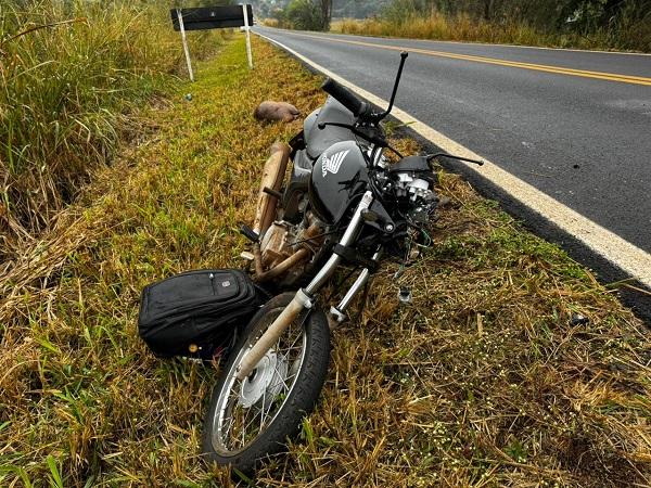 A neblina presente pela rodovia pode ter contribuído para a ocorrência do acidente, dificultando a visão do motociclista, que pode não ter visto o animal.