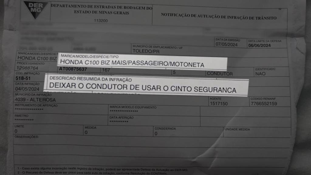 O nome do proprietário é o mesmo, endereço, dados pessoais e placa da moto. Nessa história que surpreendeu e tirou alguns risos, tem ainda outros pontos incoerentes, como por exemplo: o registro da infração de trânsito indica que aconteceu na cidade de Alterosa, em Minas Gerais, no quilômetro 32 da MG 184, no dia 4 de maio deste ano, que fica a 1.080 km de Toledo. O detalhe é que de acordo com a família, nunca sequer estiveram no território mineiro.