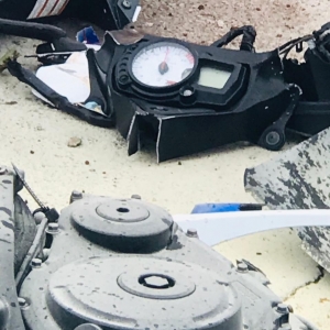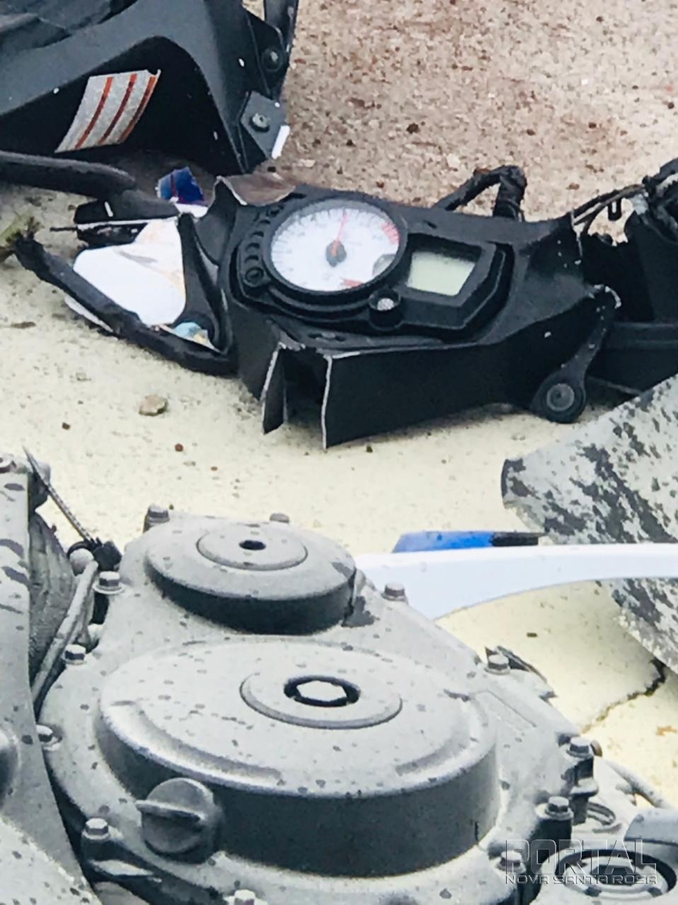 A motocicleta ficou completamente destruída, com várias partes/peças espalhadas pelo local do acidente. Após a colisão ela ainda pegou fogo e teve que ser controlado por extintores de populares que passavam pelo local.