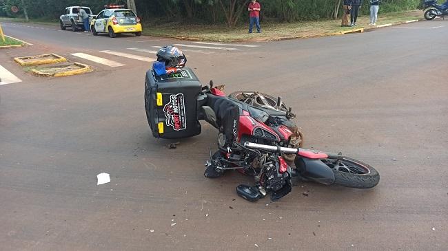 Uma colisão entre moto e caminhonete resultou com ferimentos leves no motociclista na tarde de hoje na avenida Carlos Barbosa com a rua Celeste Muraro no bairro Vila industrial em Toledo.