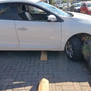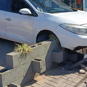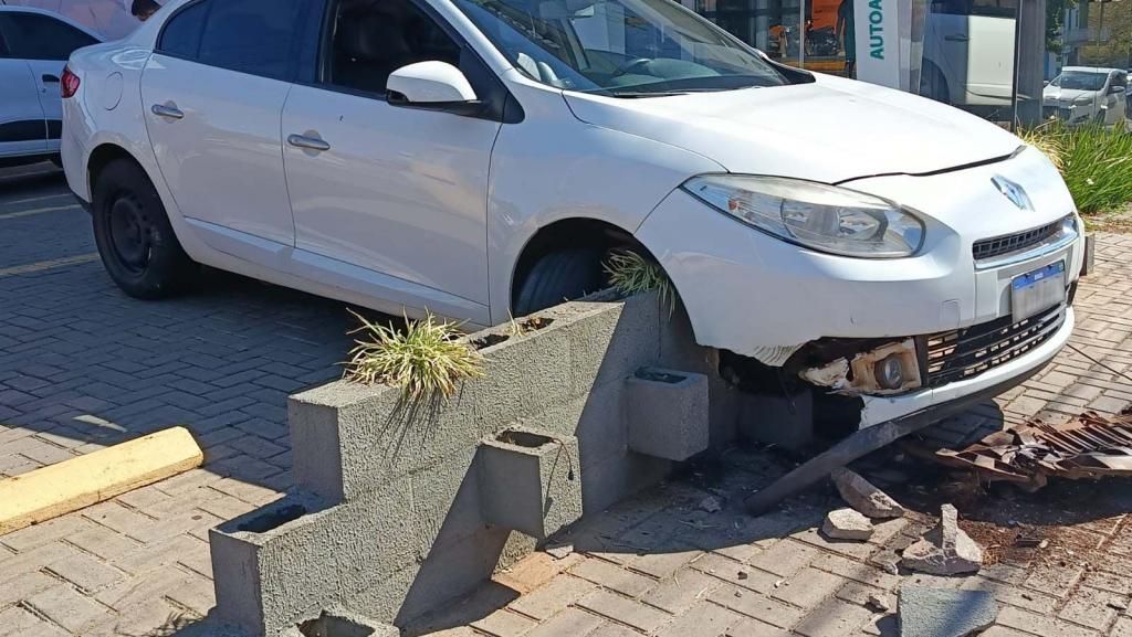 Com isso, o veículo avançou e atingiu a traseira de um Renault Kwid, que estava estacionado em frente à instituição bancária. Em seguida, o Fluence ainda colidiu contra uma mureta, ficando parcialmente suspenso sobre a estrutura.