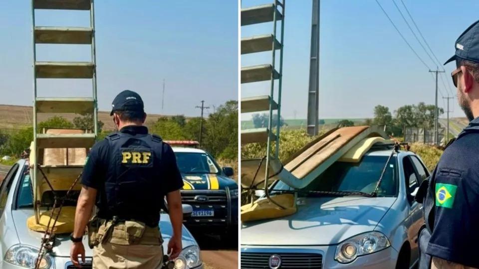 Um caso inusitado foi registrado pela Polícia Rodoviária Federal (PRF) na BR 163, em Toledo, no último domingo (18). Um veículo Fiat Palio transportava um escorregador infantil sobre o teto e o capô do carro.