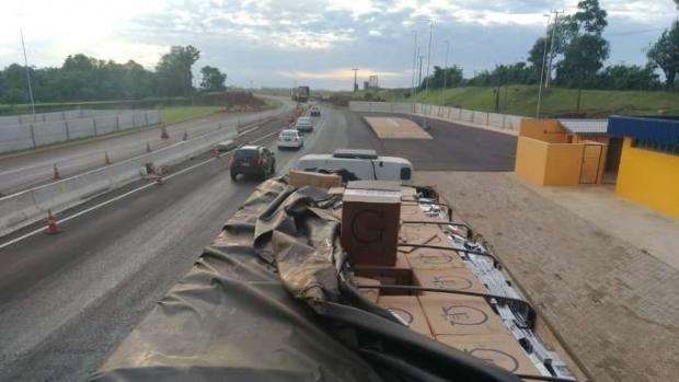 Os agentes faziam uma fiscalização de rotina no Pedágio de Cascavel quando suspeitaram do motorista e decidiram fazer uma inspeção detalhada na carga. No compartimento de carga, assim que a equipe retirou a lona encontrou várias caixas e maços de cigarros.