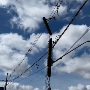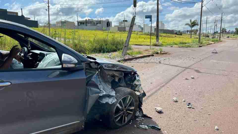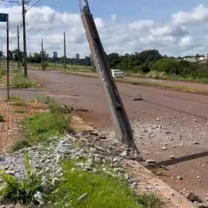 Um poste ficou destruído após uma motorista passar mal e o carro que ela conduzia colidir contra a estrutura na Avenida Guaíra, próximo ao cruzamento com a Rua Guiomar da Costa Marques, no bairro Recanto Tropical, em Cascavel, nesta sexta-feira (9).