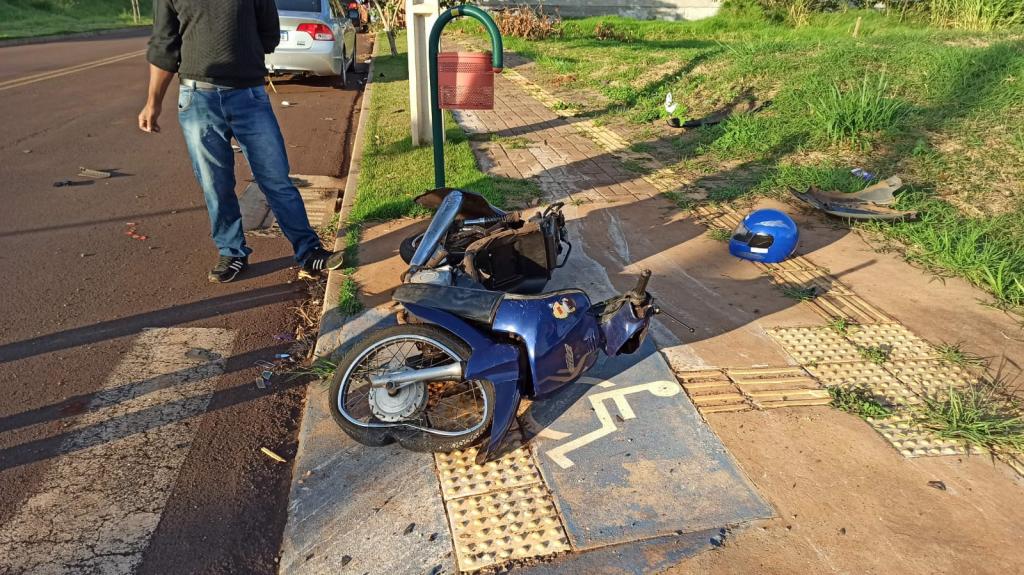O carro trafegava pela rua Américo Sartori e a moto seguia pela rua Matias Fuhr e no cruzamento das vias aconteceu a batida.