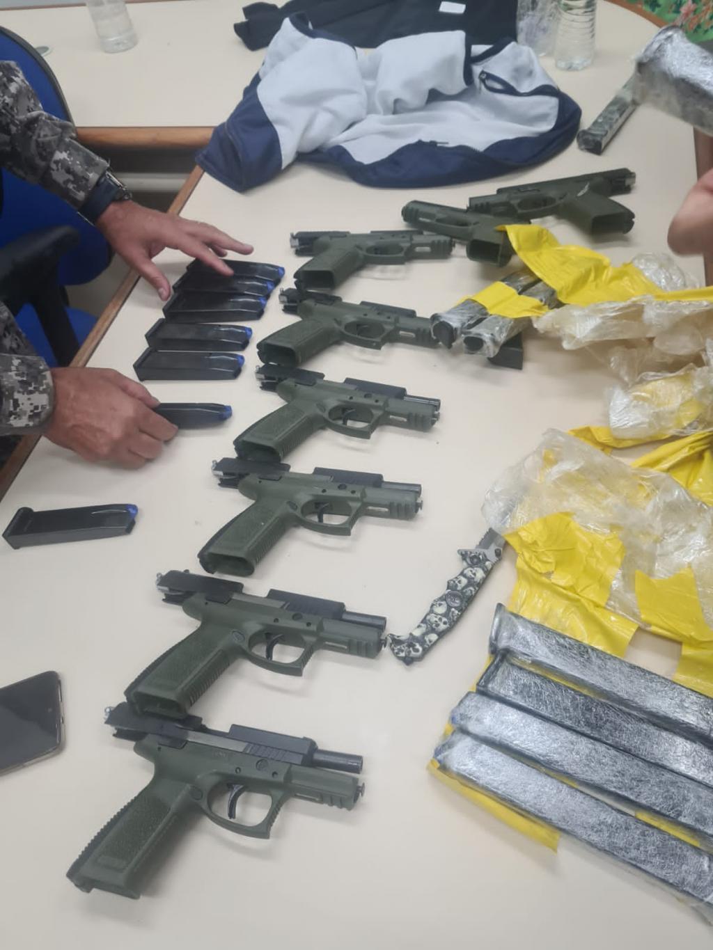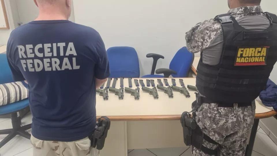 Um kit rajada e oito pistolas turcas com numeração raspada e 16 carregadores foram apreendidos presos ao corpo de uma mulher na Ponte da Amizade, em Foz do Iguaçu (PR), na manhã desta terça-feira (4).