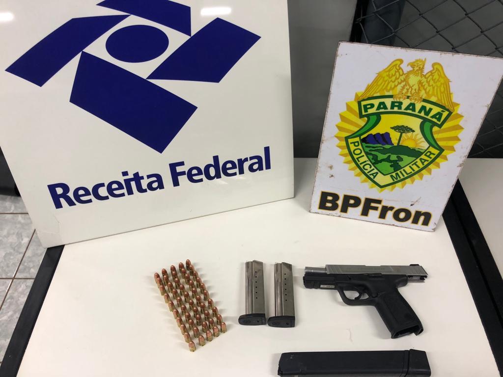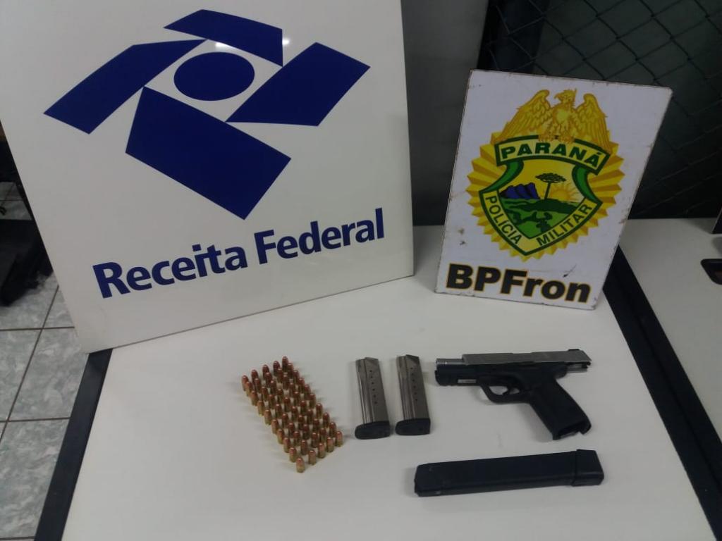 Após revista aos passageiros, foi encontrado na axila da mulher uma pistola 9 milímetros de uso restrito da polícia, mais três carregadores - um deles estendido- e aproximadamente 50 munições.