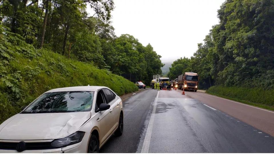 Conforme informado pela PRF (Polícia Rodoviária Federal), o acidente aconteceu no quilômetro 133 da rodovia e envolveu um Volkswagen Virtus com placas de São Paulo. Uma das faixas da rodovias ficou interditada para os trabalhos de perícia.